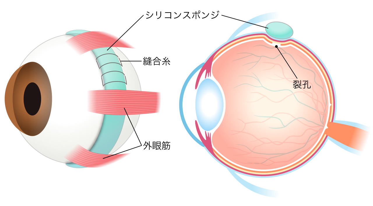 裂孔原性網膜剥離に対して施行される術式です。硝子体手術とは異なり、シリコンスポンジ(バックル)を白目に縫い付けることで、眼球を外側から圧迫し、冷凍凝固を行い、裂孔を閉鎖することにより、網膜剥離を治療します。